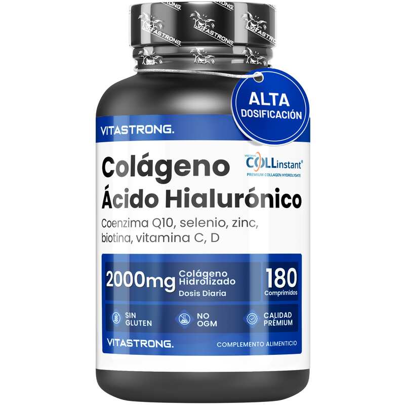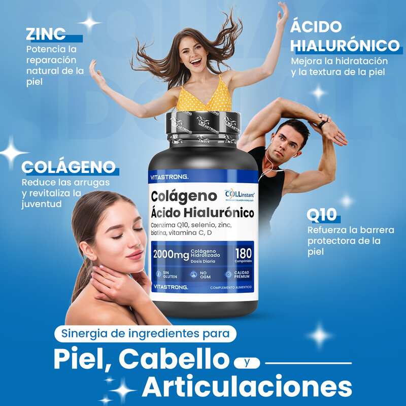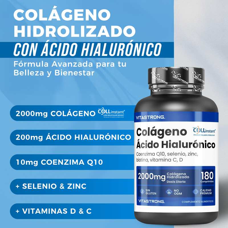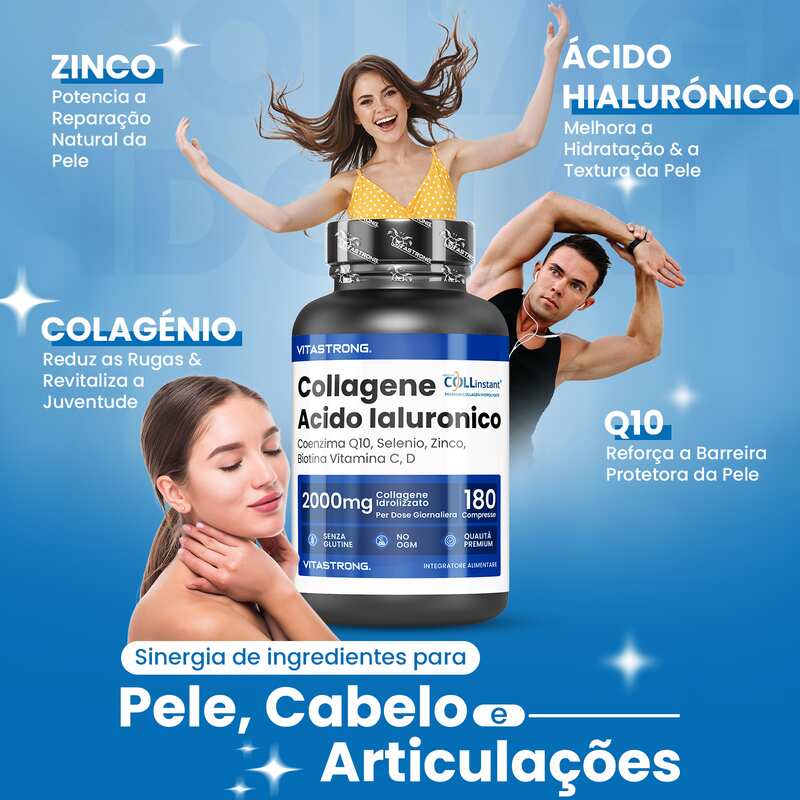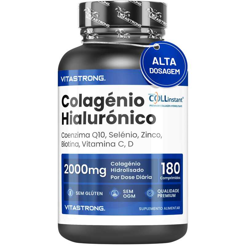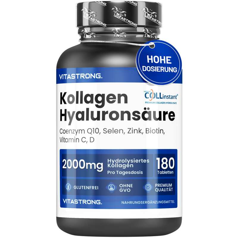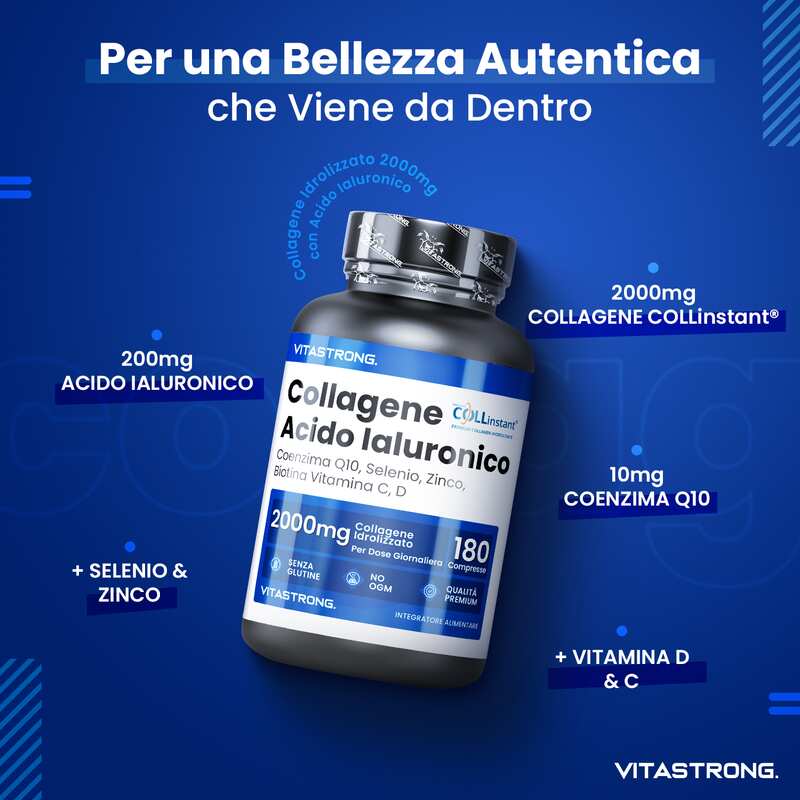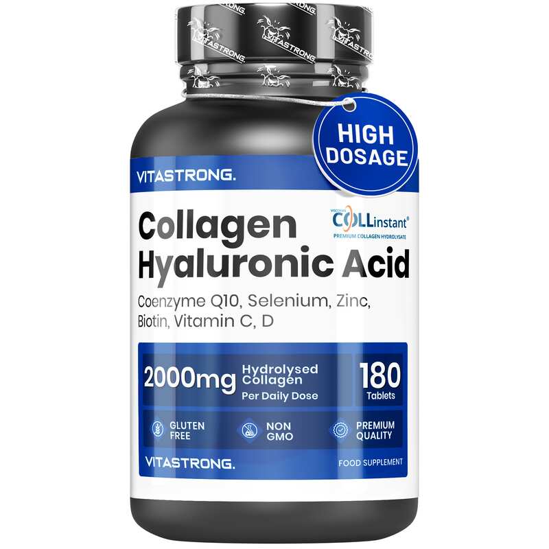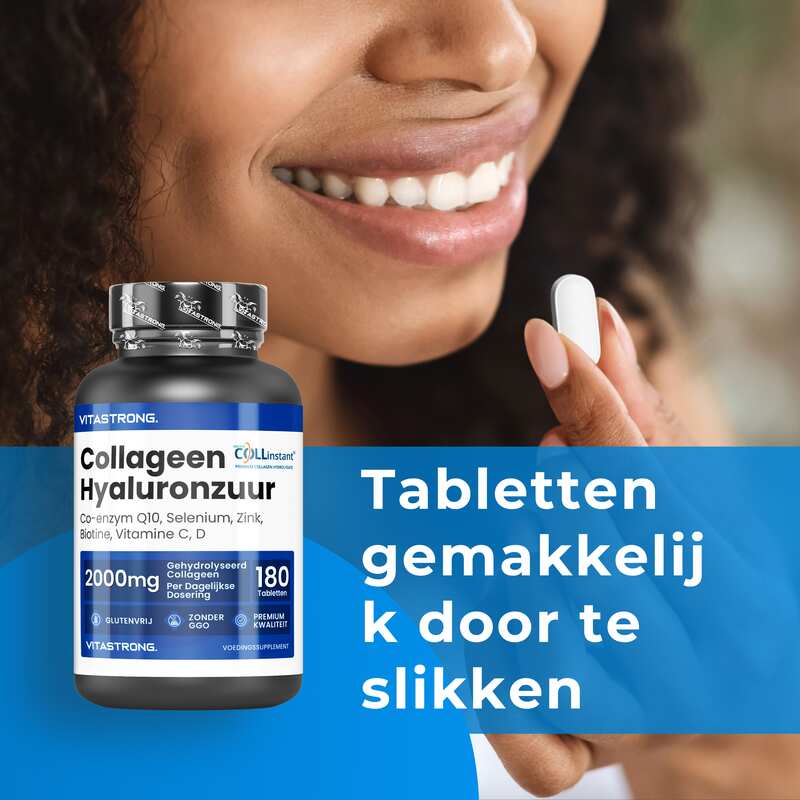 VITASTRONG Collageen & Hyaluronzuur is een innovatief supplement dat is ontworpen om de gezondheid en schoonheid van huid, haar en nagels te ondersteunen en daarnaast de elasticiteit van de huid en de gezondheid van de gewrichten te verbeteren. Dankzij de combinatie van hoogwaardig gehydrolyseerd collageen (COLLinstant®) en hyaluronzuur werkt het product van binnenuit om weefsel te hydrateren en te regenereren.