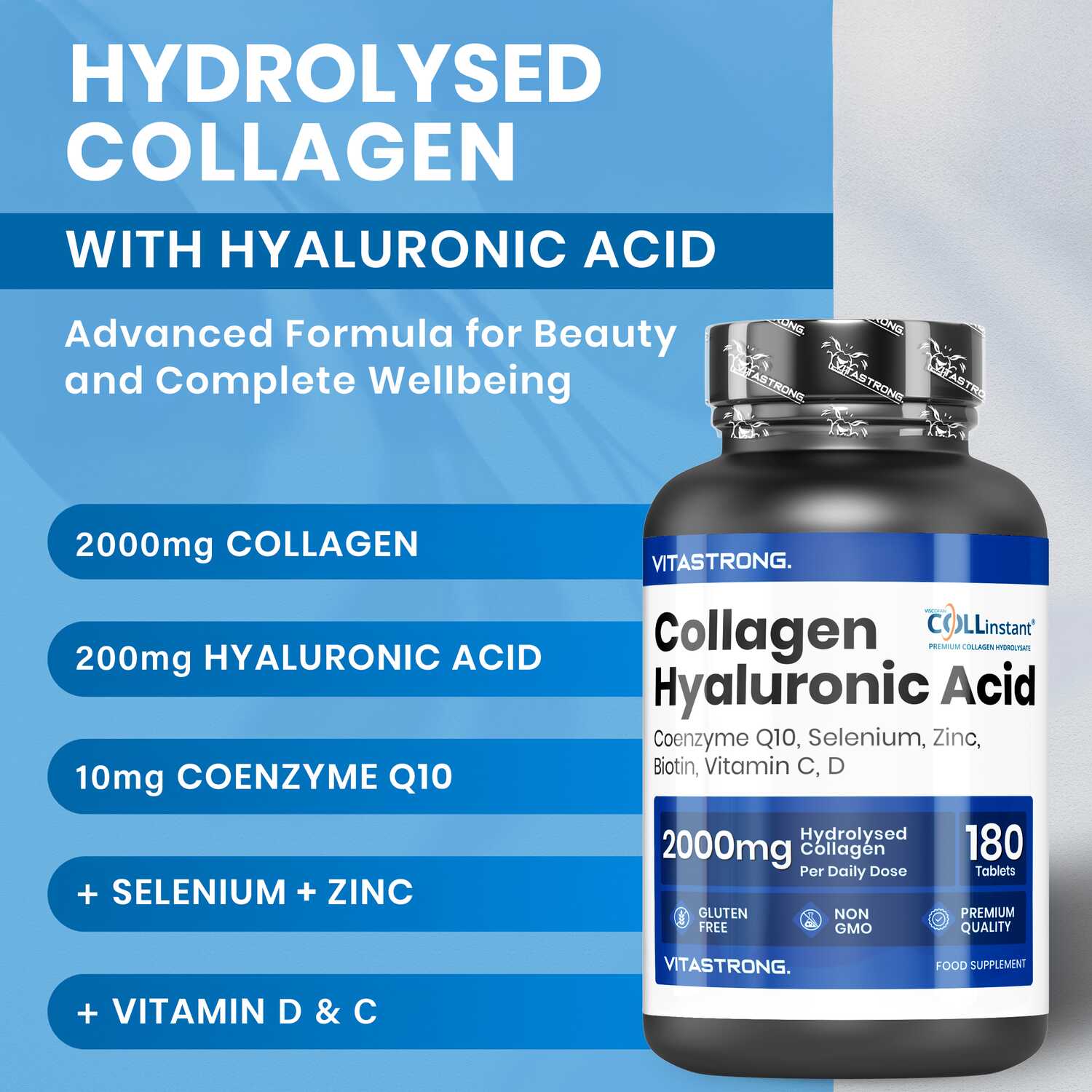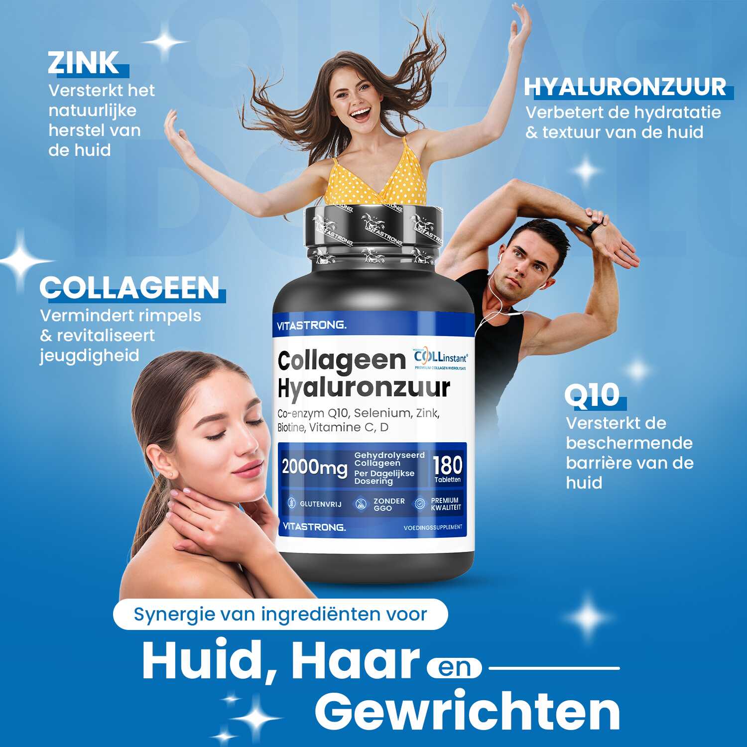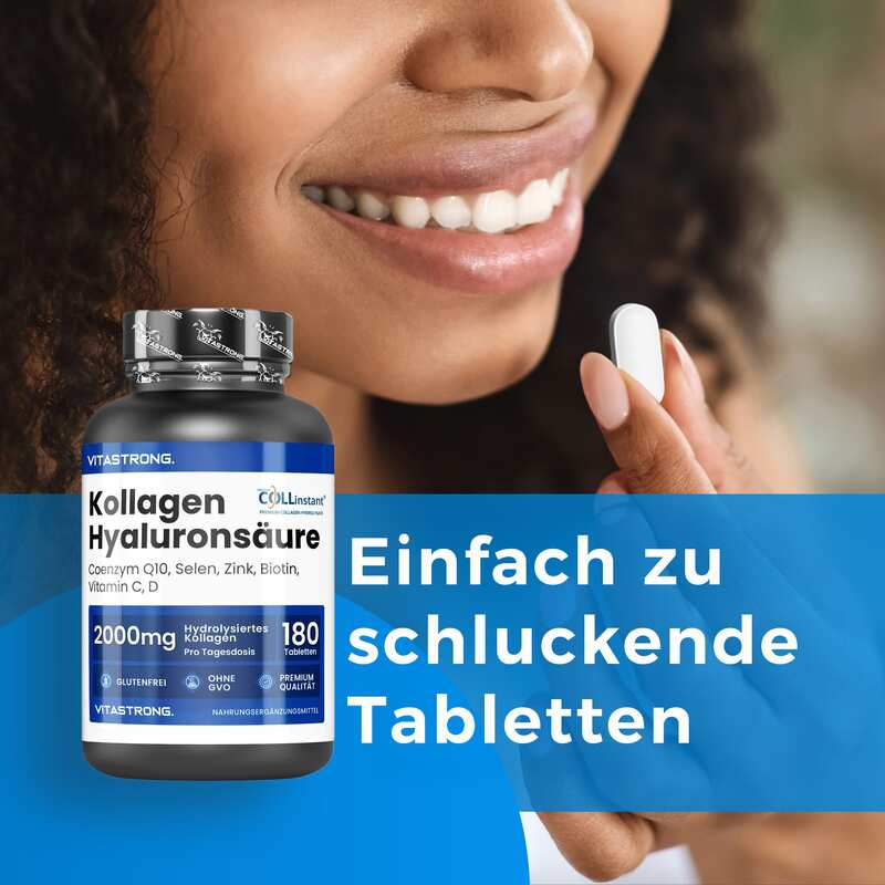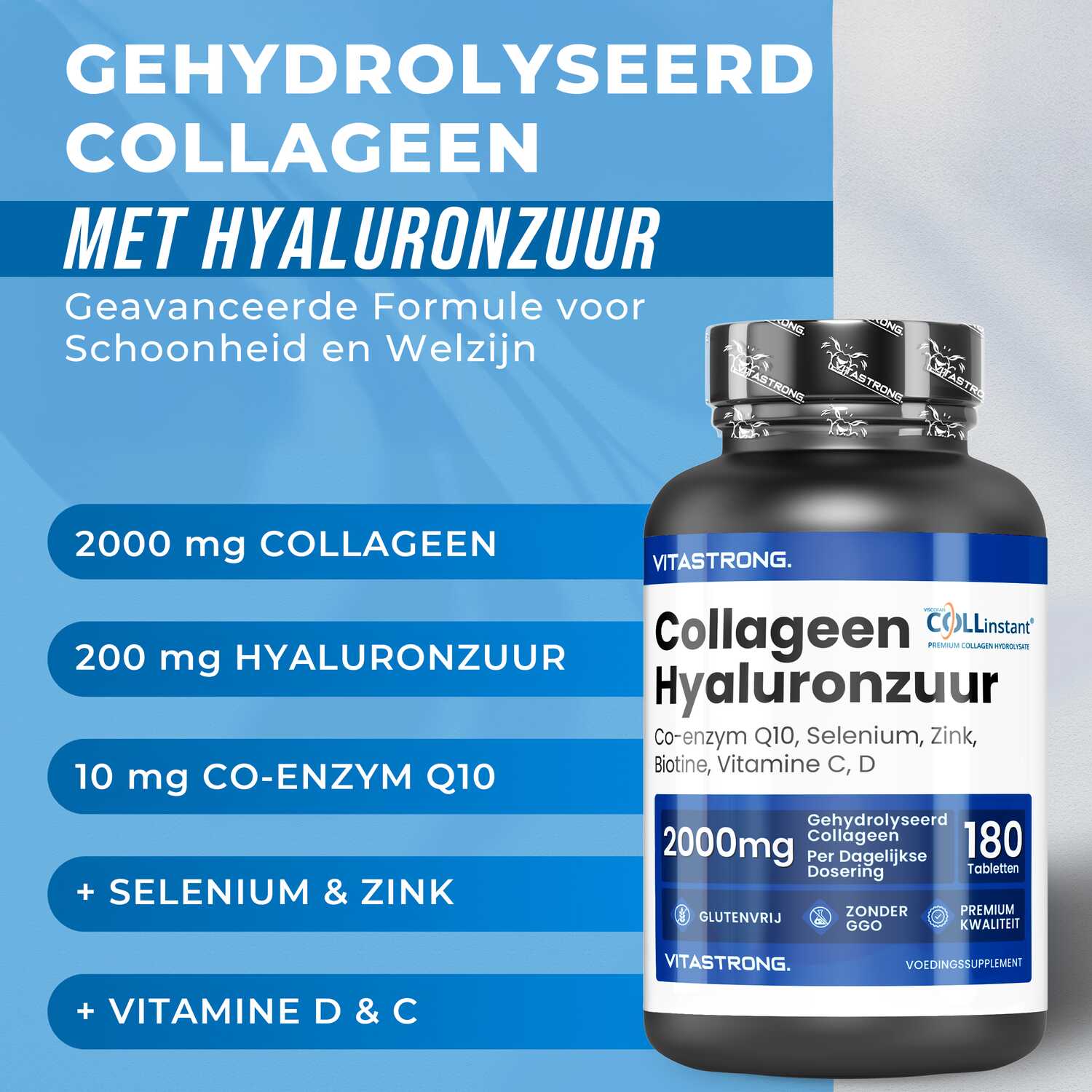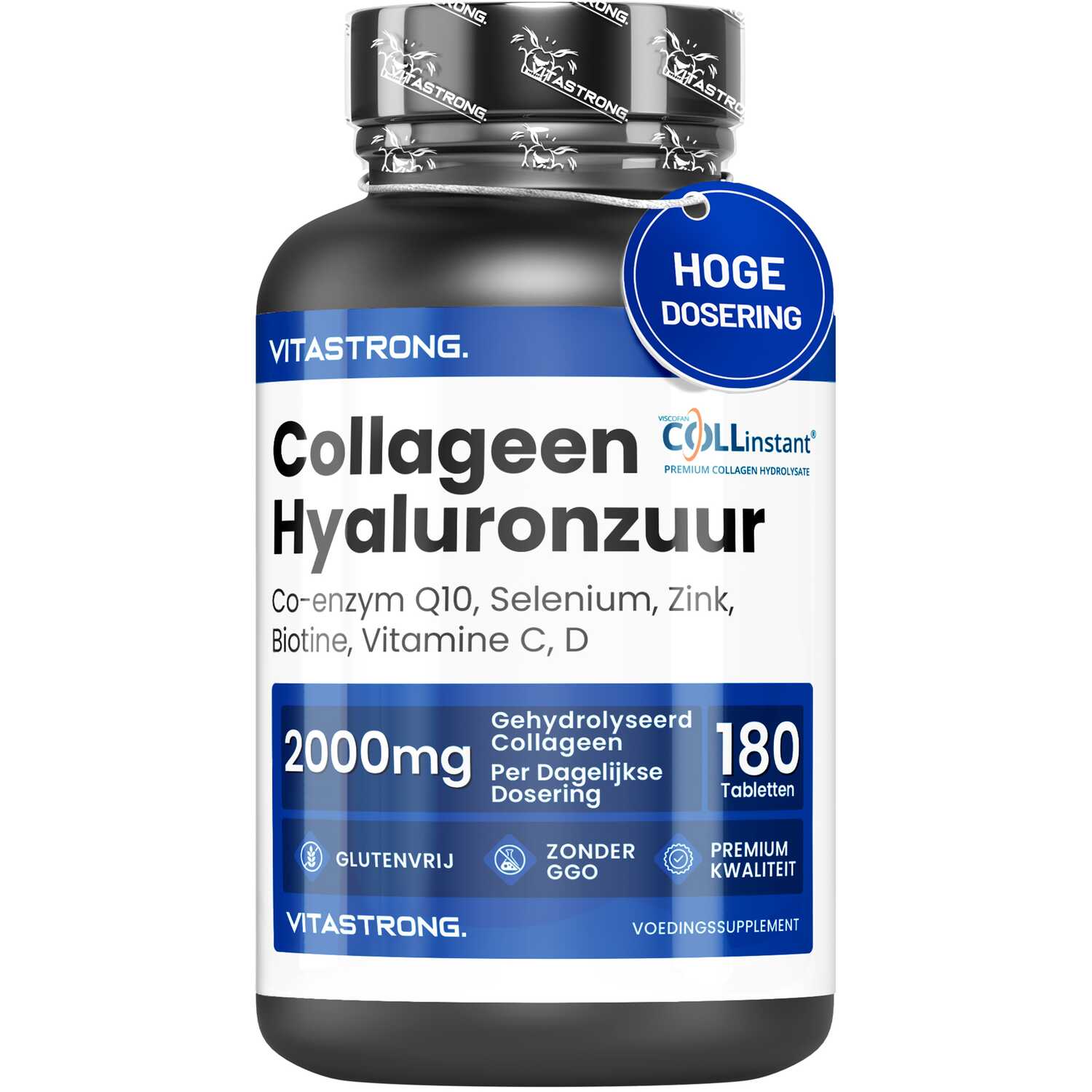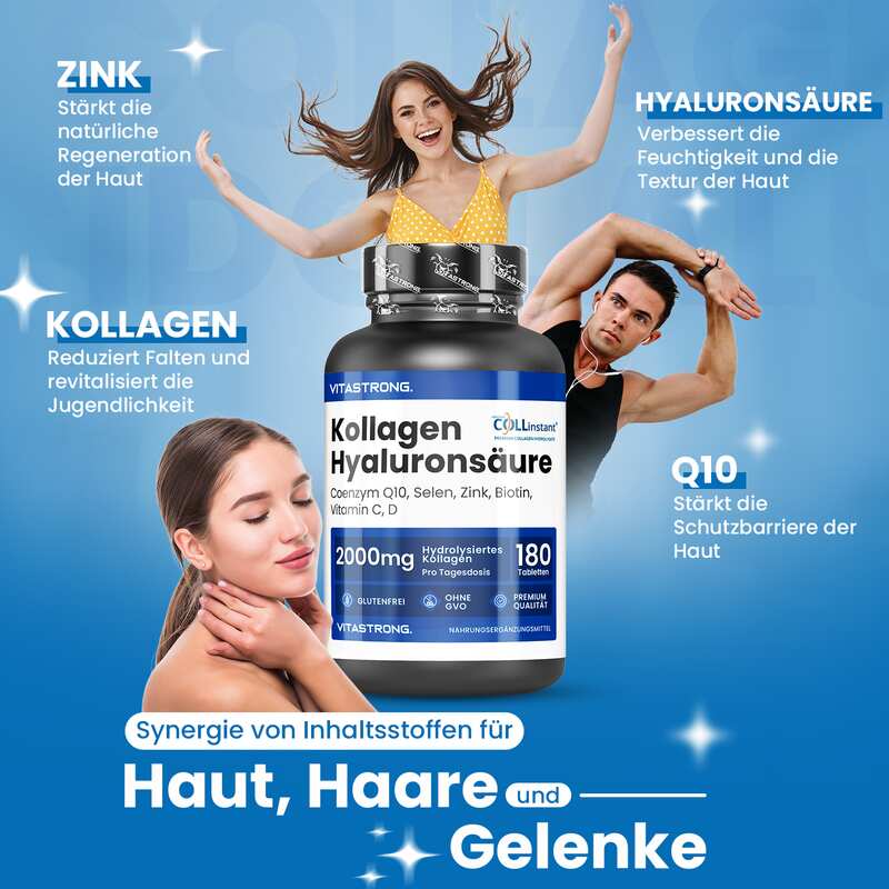 VITASTRONG Collageen & Hyaluronzuur is een innovatief supplement dat is ontworpen om de gezondheid en schoonheid van huid, haar en nagels te ondersteunen en daarnaast de elasticiteit van de huid en de gezondheid van de gewrichten te verbeteren. Dankzij de combinatie van hoogwaardig gehydrolyseerd collageen (COLLinstant®) en hyaluronzuur werkt het product van binnenuit om weefsel te hydrateren en te regenereren.