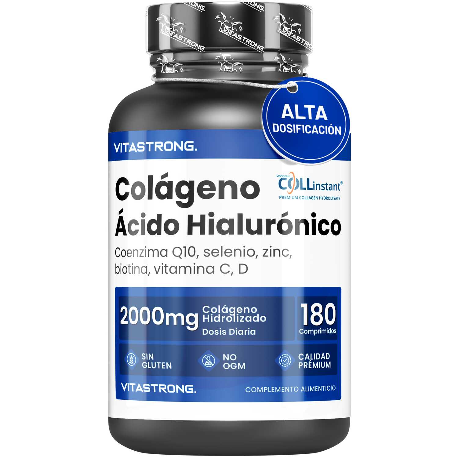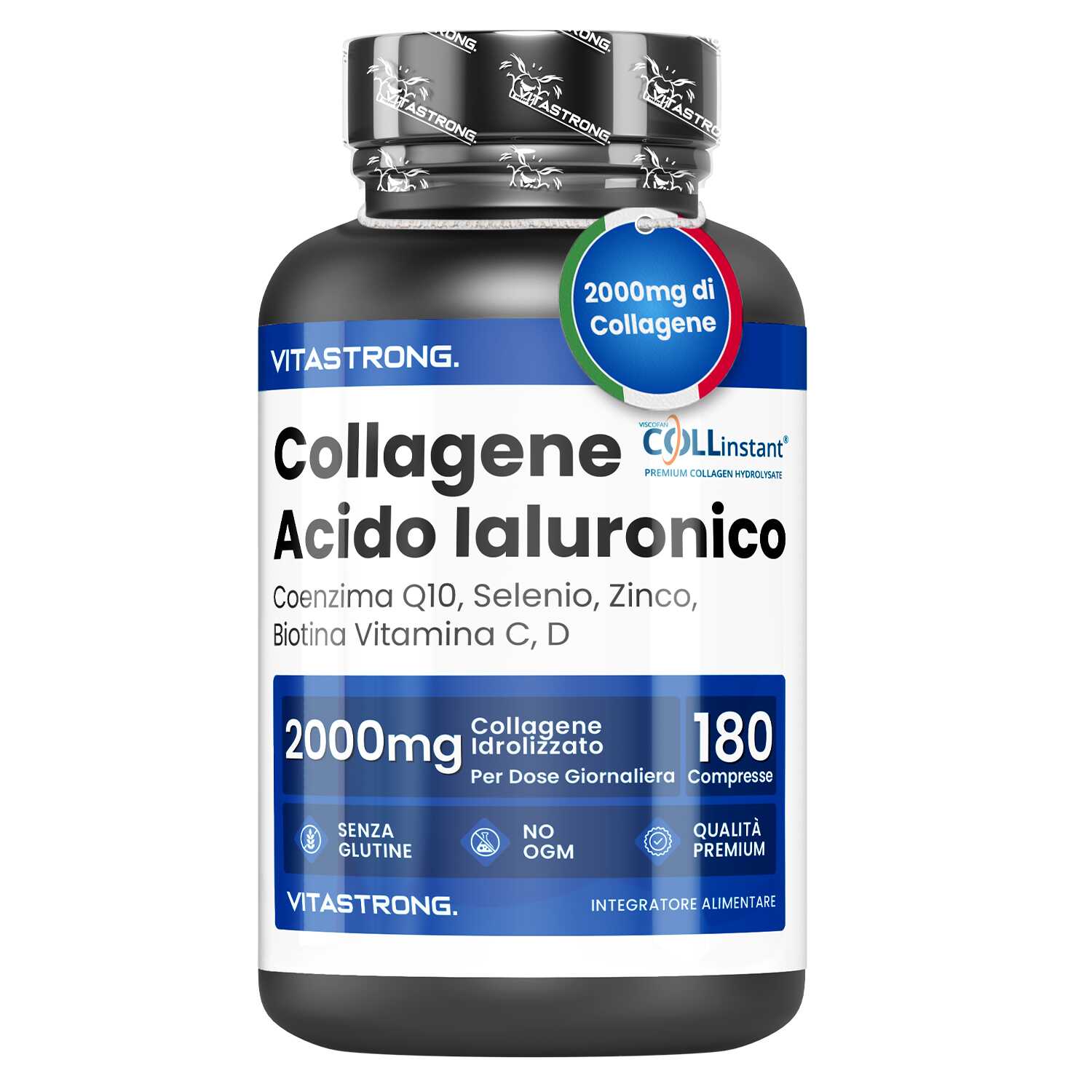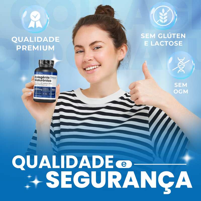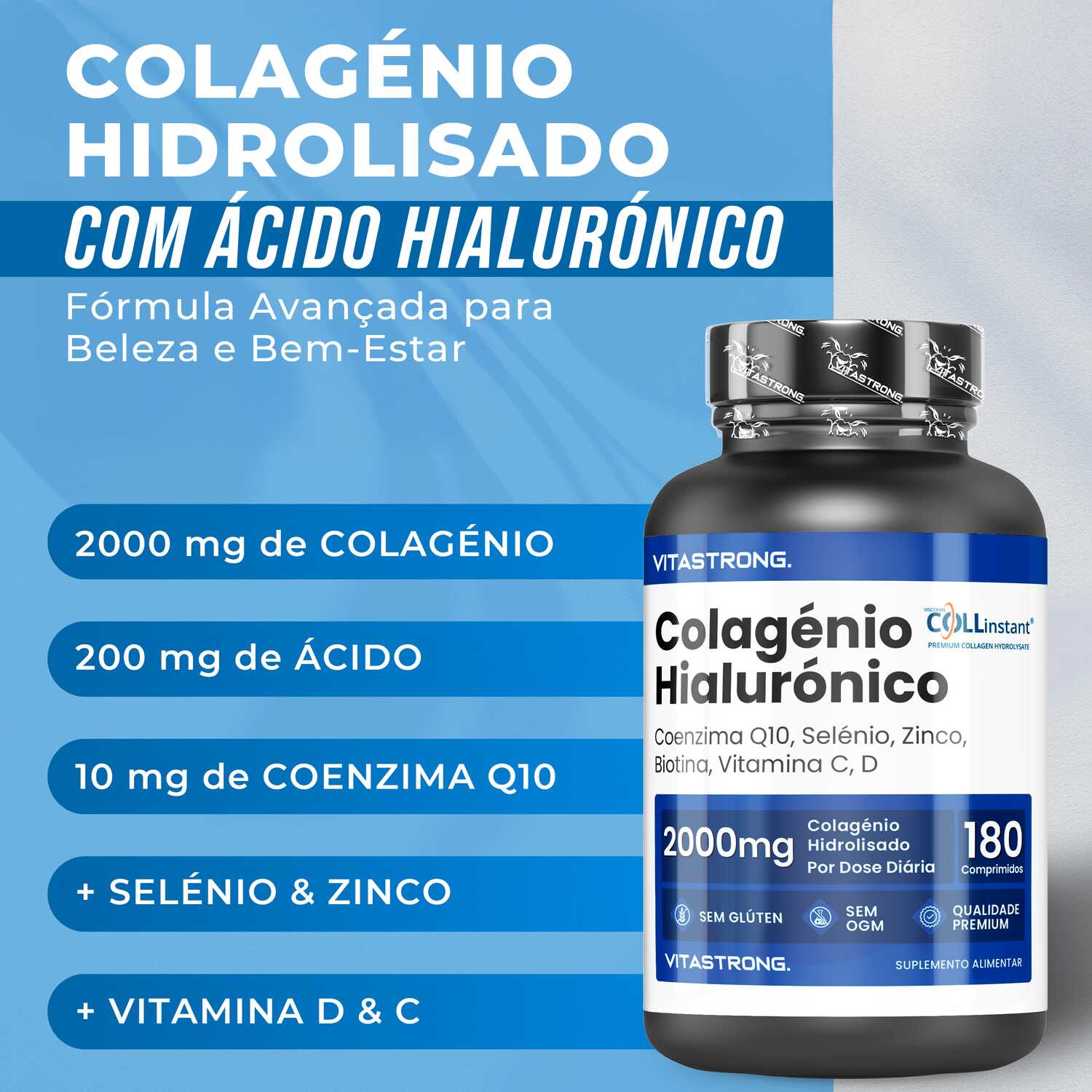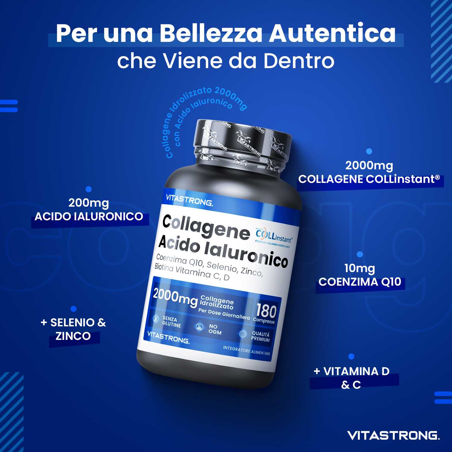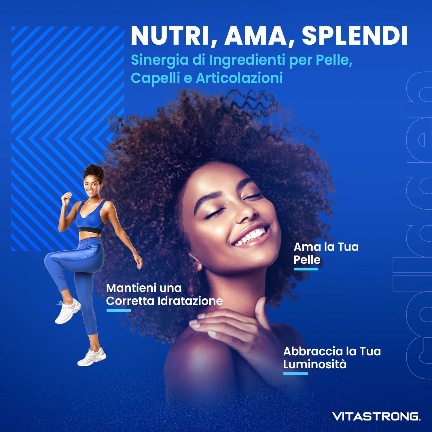 VITASTRONG Collageen & Hyaluronzuur is een innovatief supplement dat is ontworpen om de gezondheid en schoonheid van huid, haar en nagels te ondersteunen en daarnaast de elasticiteit van de huid en de gezondheid van de gewrichten te verbeteren. Dankzij de combinatie van hoogwaardig gehydrolyseerd collageen (COLLinstant®) en hyaluronzuur werkt het product van binnenuit om weefsel te hydrateren en te regenereren.