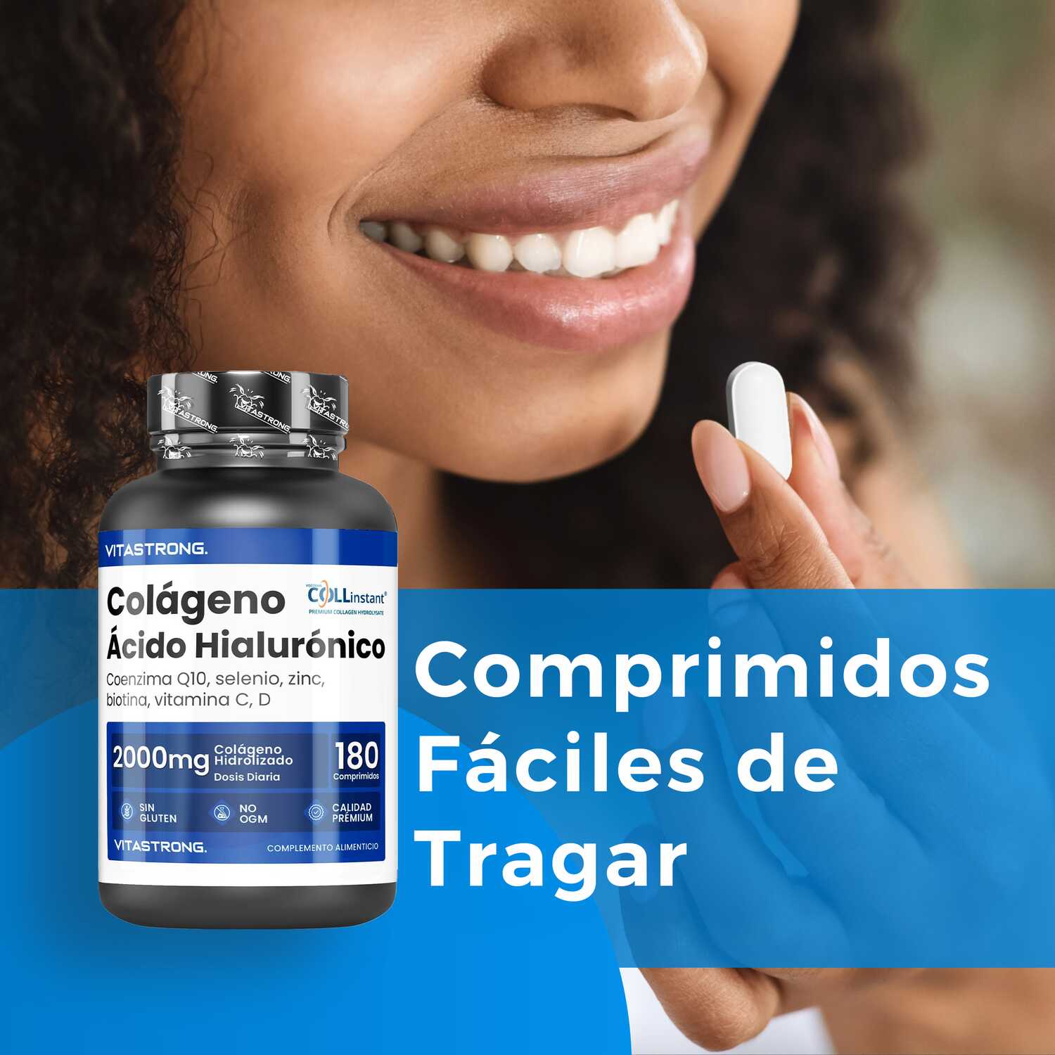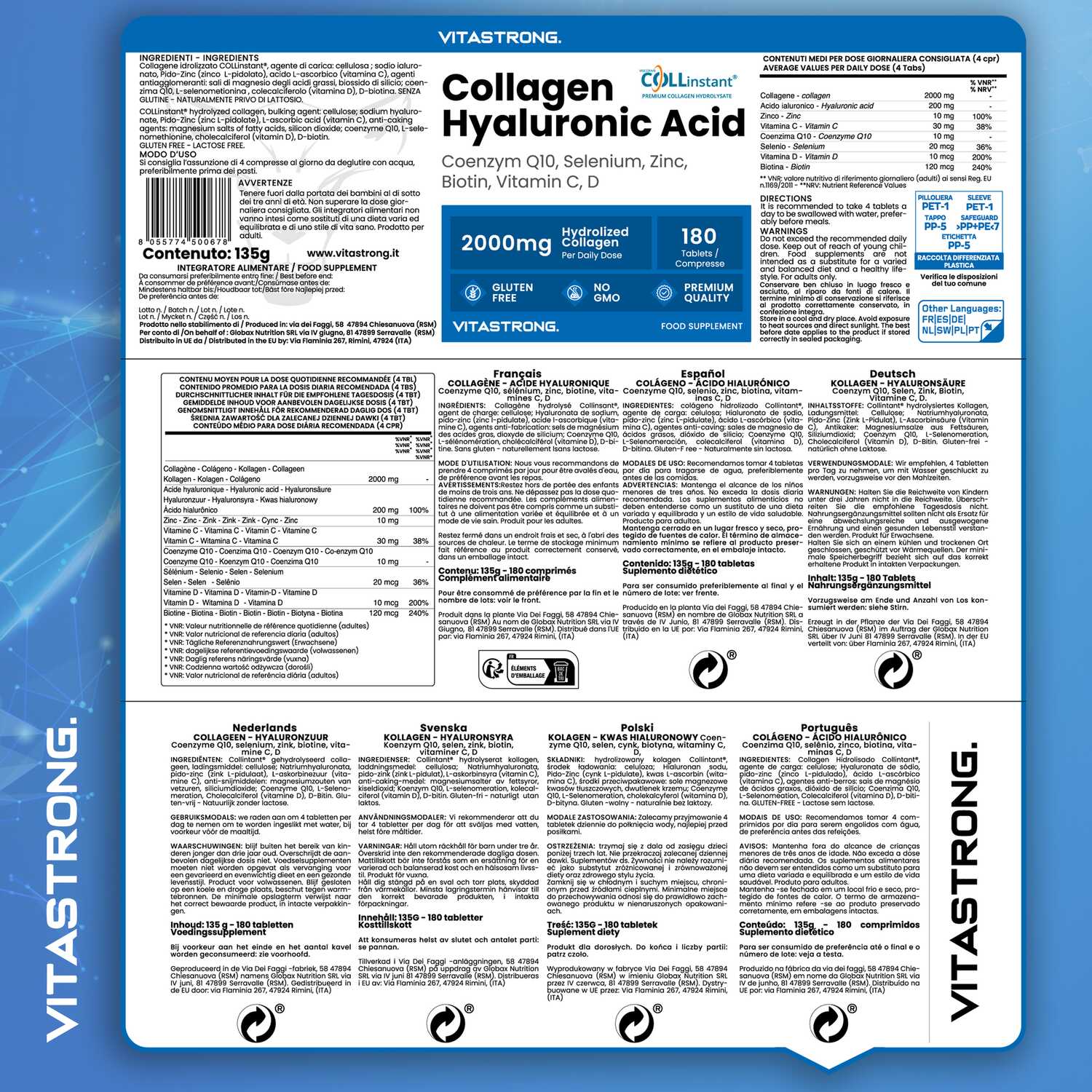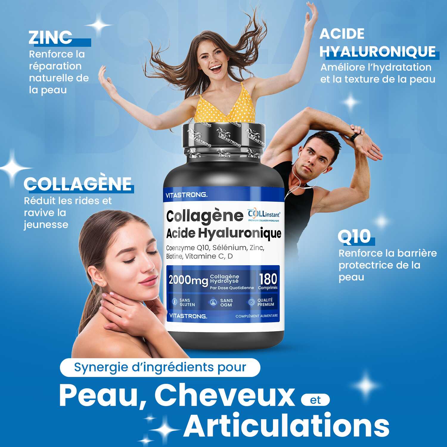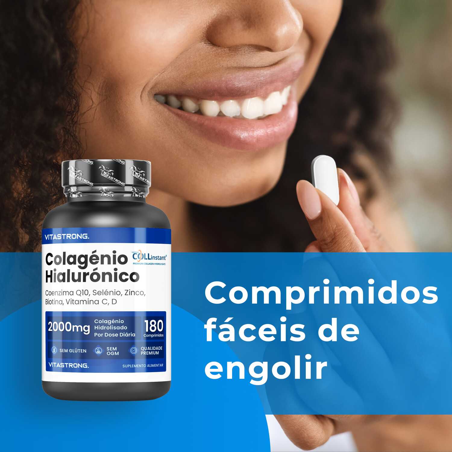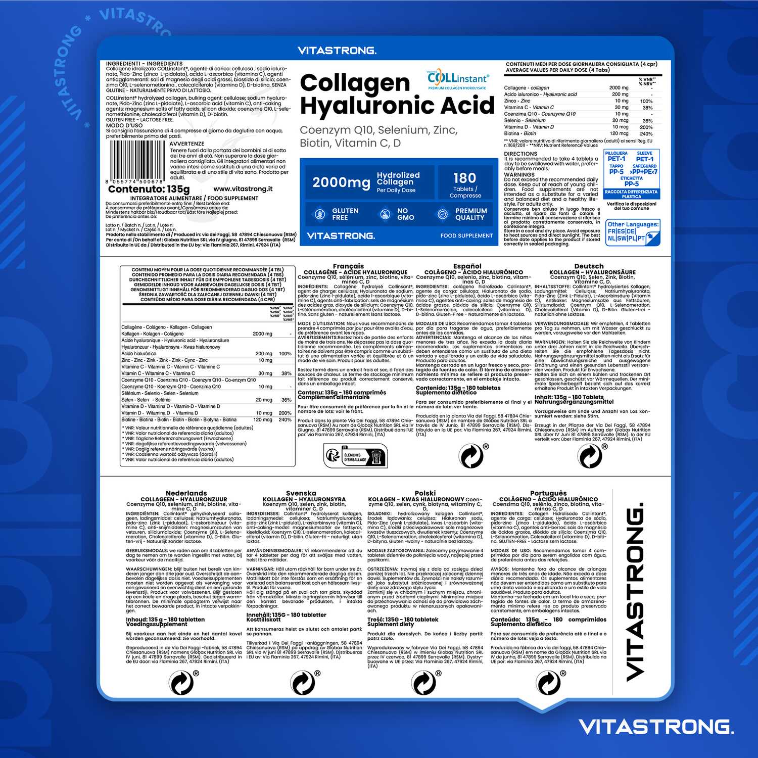 VITASTRONG Collageen & Hyaluronzuur is een innovatief supplement dat is ontworpen om de gezondheid en schoonheid van huid, haar en nagels te ondersteunen en daarnaast de elasticiteit van de huid en de gezondheid van de gewrichten te verbeteren. Dankzij de combinatie van hoogwaardig gehydrolyseerd collageen (COLLinstant®) en hyaluronzuur werkt het product van binnenuit om weefsel te hydrateren en te regenereren.