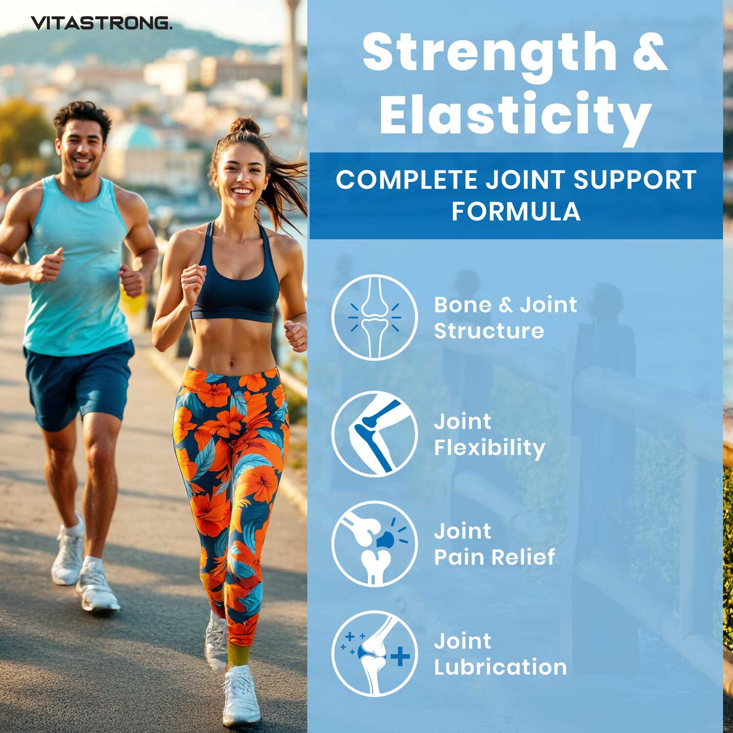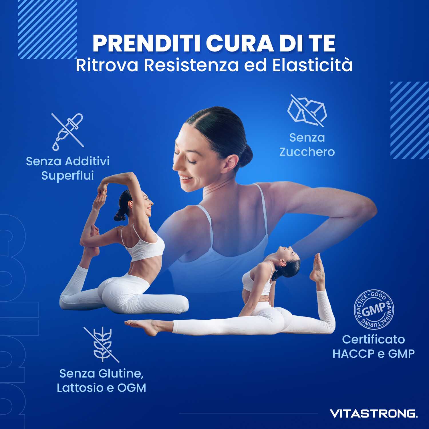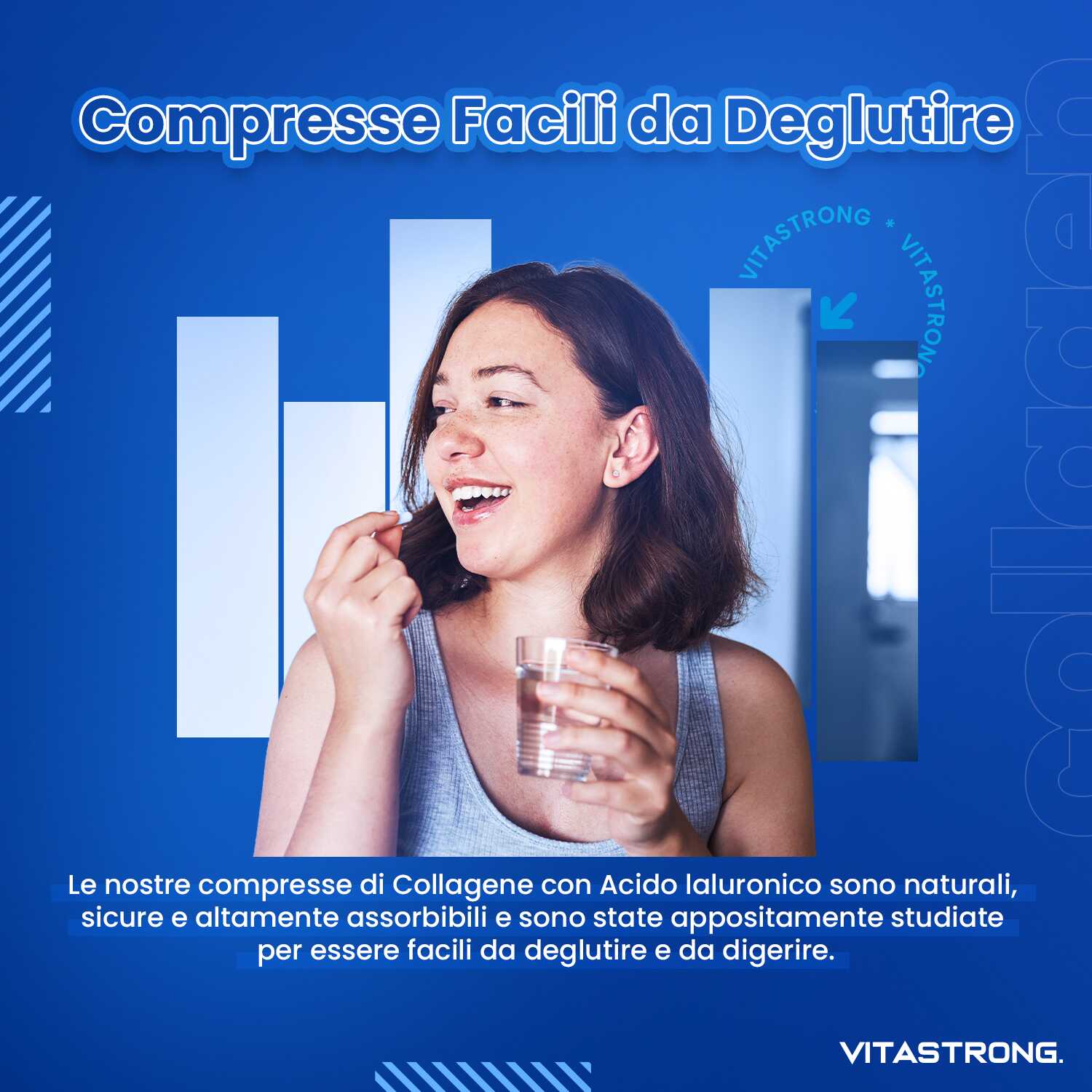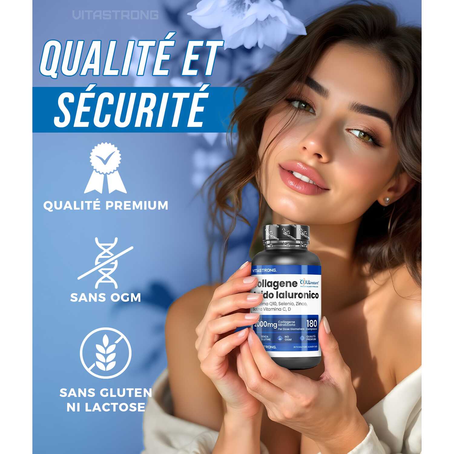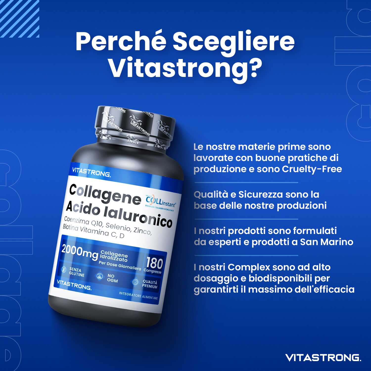 VITASTRONG Collageen & Hyaluronzuur is een innovatief supplement dat is ontworpen om de gezondheid en schoonheid van huid, haar en nagels te ondersteunen en daarnaast de elasticiteit van de huid en de gezondheid van de gewrichten te verbeteren. Dankzij de combinatie van hoogwaardig gehydrolyseerd collageen (COLLinstant®) en hyaluronzuur werkt het product van binnenuit om weefsel te hydrateren en te regenereren.