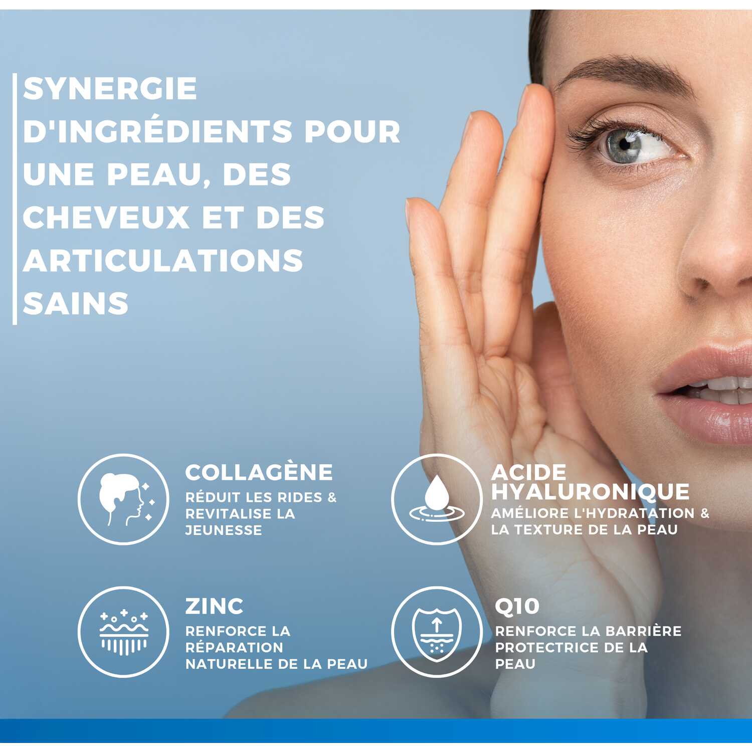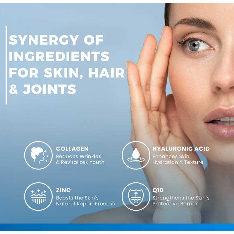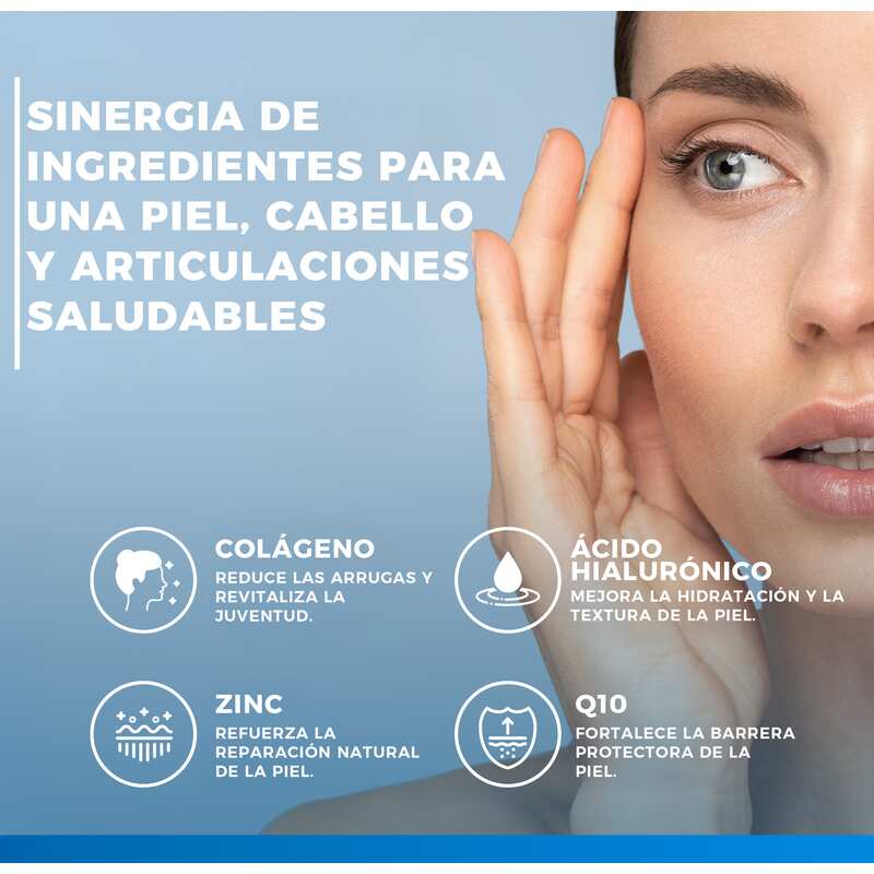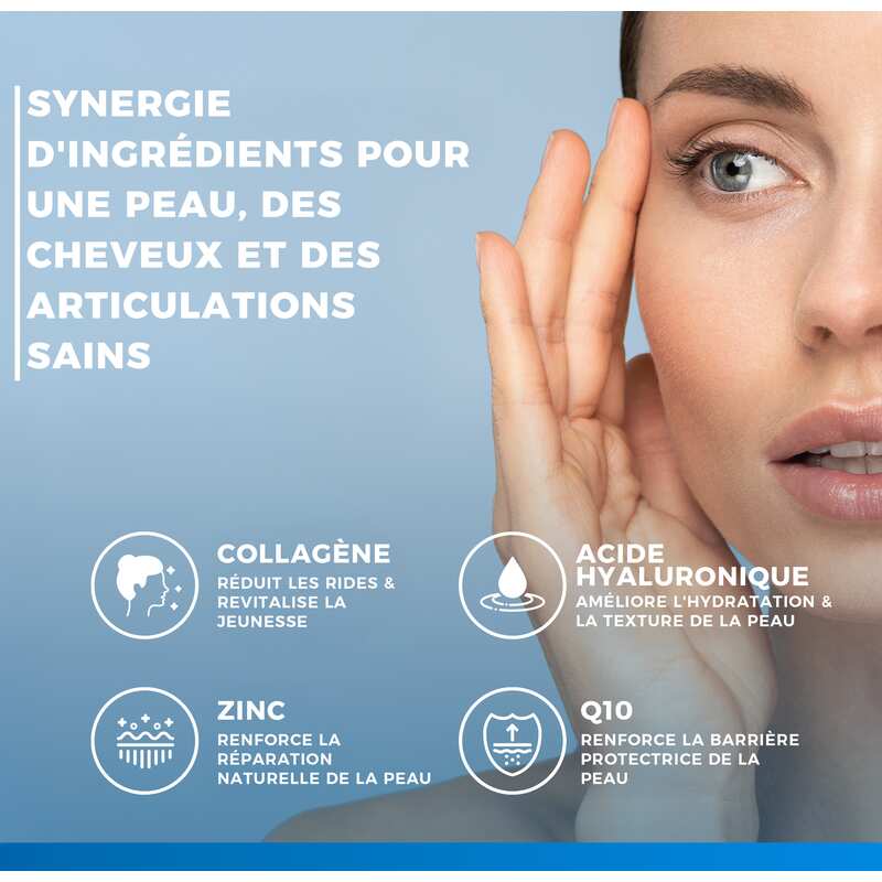 Ingrediënten: COLLinstant® gehydrolyseerd collageen, vulstof: microkristallijne cellulose; natriumhyaluronaat, zinkpidolaat, ascorbinezuur (vitamine C), antiklontermiddelen: magnesiumzouten van vetzuren, siliciumdioxide; co-enzym Q10, selenium L-methionine, cholecalciferol (vitamine D), biotine.