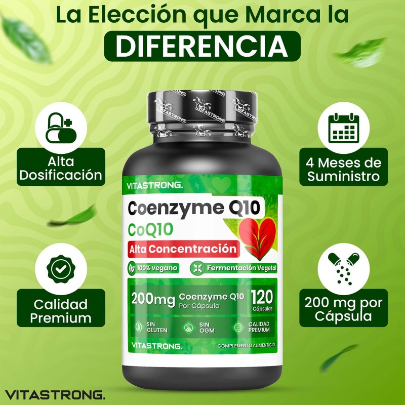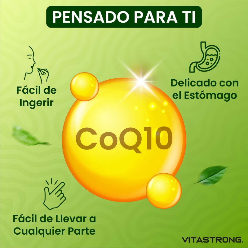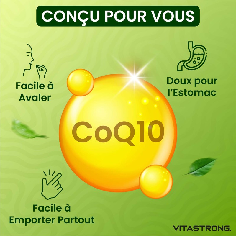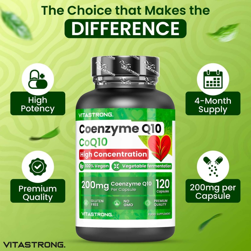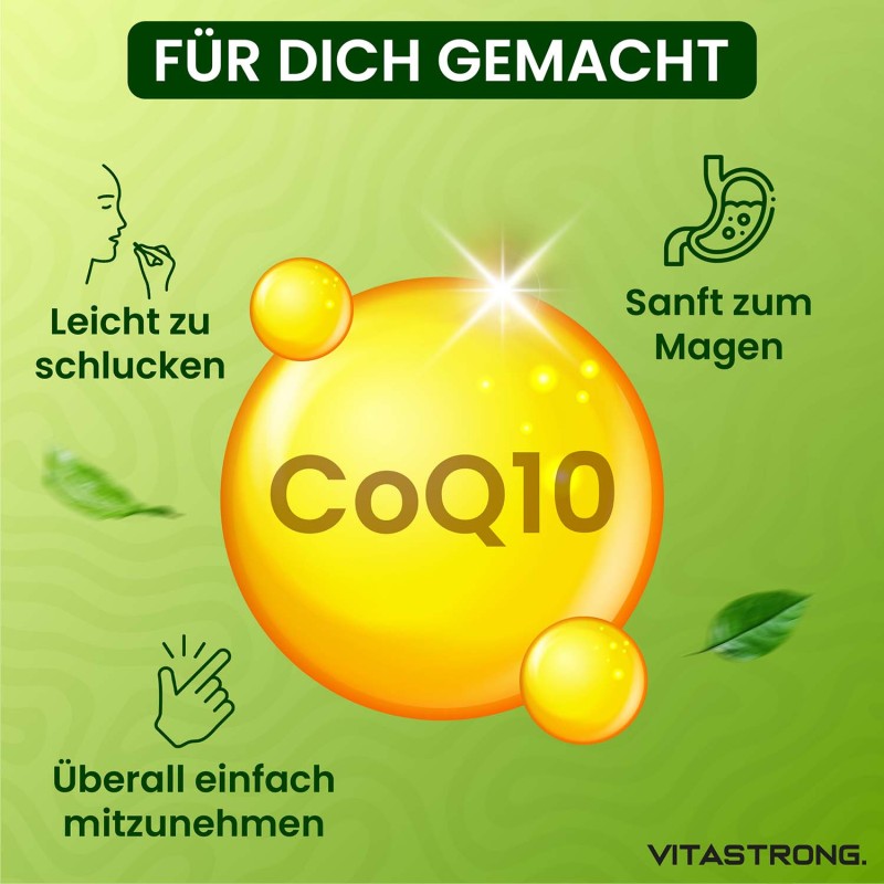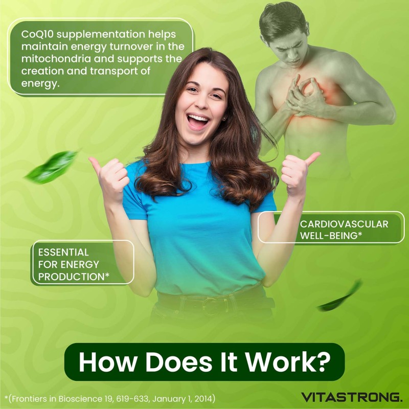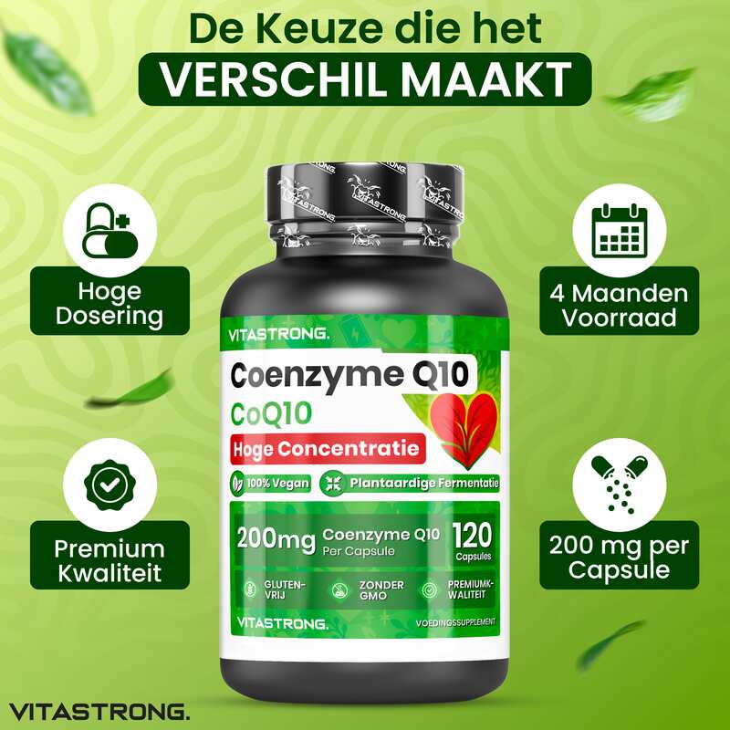 Vitastrong Co-enzym Q10 is een supplement met een hoge concentratie CoQ10, een stof die van nature in ons lichaam voorkomt en essentieel is voor de energieproductie op cellulair niveau. CoQ10 speelt een cruciale rol in het energiemetabolisme en fungeert als een krachtige antioxidant die cellen beschermt tegen oxidatieve stress.