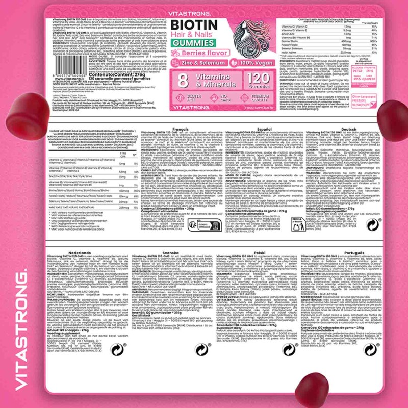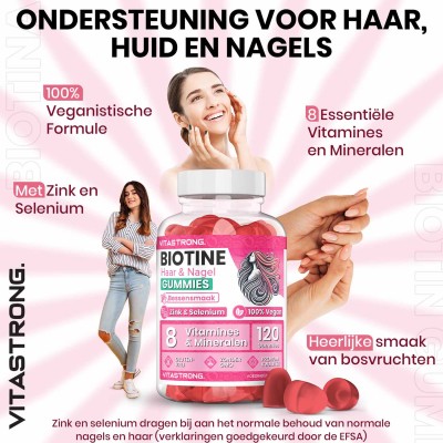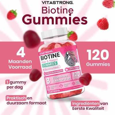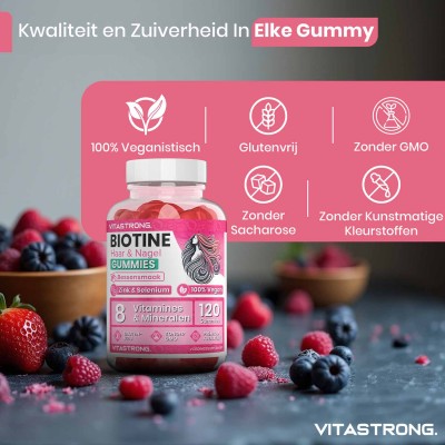 Vitastrong Biotin Gummy is een voedingssupplement in gummievorm , ontwikkeld om de gezondheid van haar en nagels op een praktische en prettige manier te ondersteunen. De formule bevat een hoge dosis biotine , samen met een complex van vitaminen en mineralen die synergetisch werken: zink, selenium, vitamine C, E, D, B6, foliumzuur en jodium.