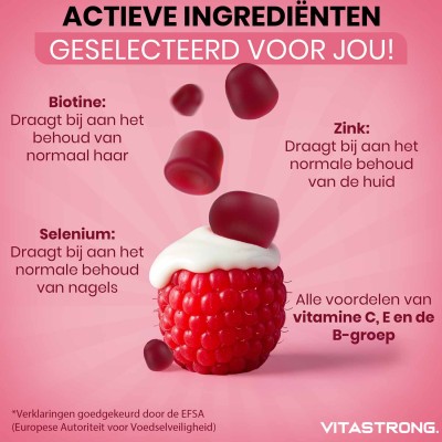 Biotine, zink, selenium en antioxidante vitamines werken synergetisch samen om de gezondheid en schoonheid van haar en nagels te ondersteunen. Dankzij de gummievorm is de inname aangenaam en constant, wat zorgt voor zichtbare resultaten op lange termijn.