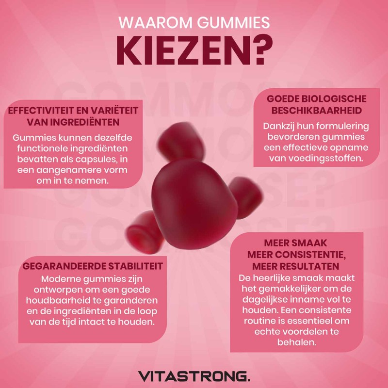 Deze gummies zijn een ideale oplossing voor wie op zoek is naar een effectief supplement, maar toch een alternatief zoekt voor de klassieke tabletten. Ze hebben een bessensmaak en een zachte textuur die gemakkelijk in te nemen is.