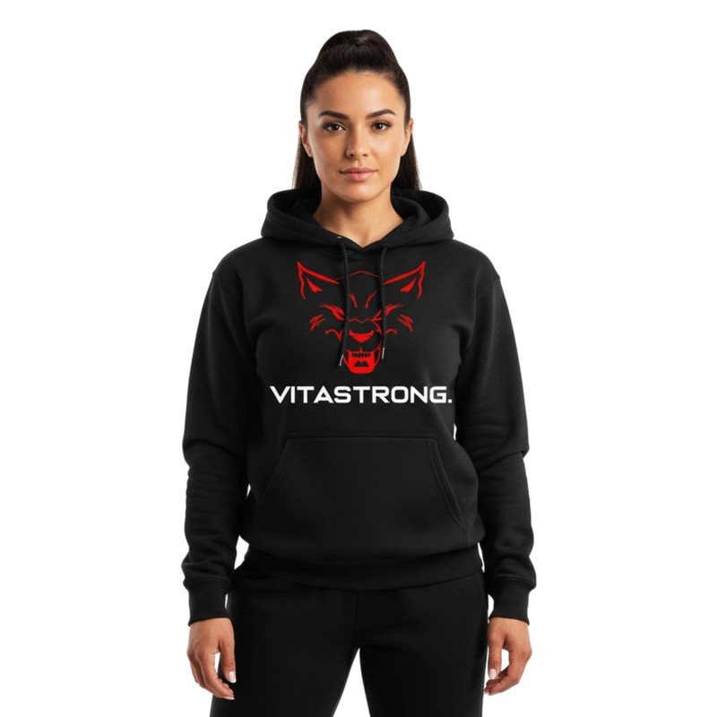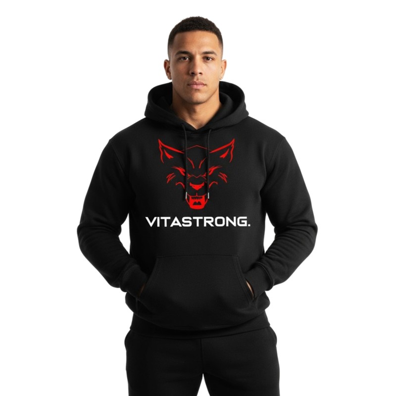 De Flagship Hoodie Black is het kledingstuk dat de Vitastrong-stijl heeft doen ontstaan. Een gedurfd ontwerp, een contrasterend logo op de voorkant en de rode wolf die de scene domineert: een symbool van macht, verbondenheid en identiteit.
