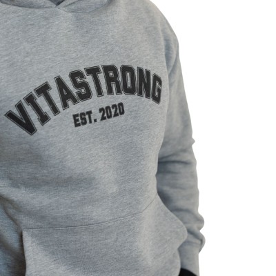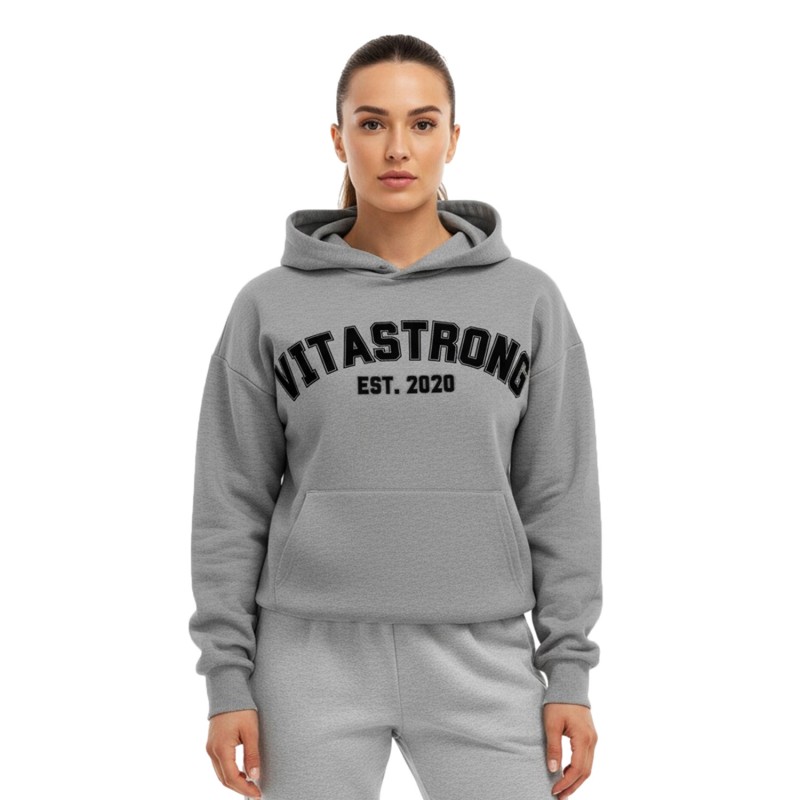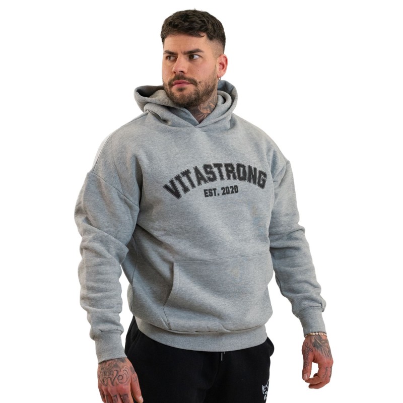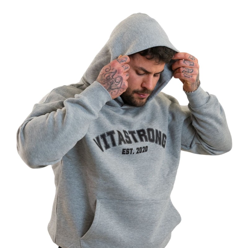De College Hoodie Grey combineert comfort, volume en stijl. Een unisex sweatshirt met een oversized pasvorm , ontworpen voor iedereen die de Vitastrong-spirit ook buiten de sportschool leeft.