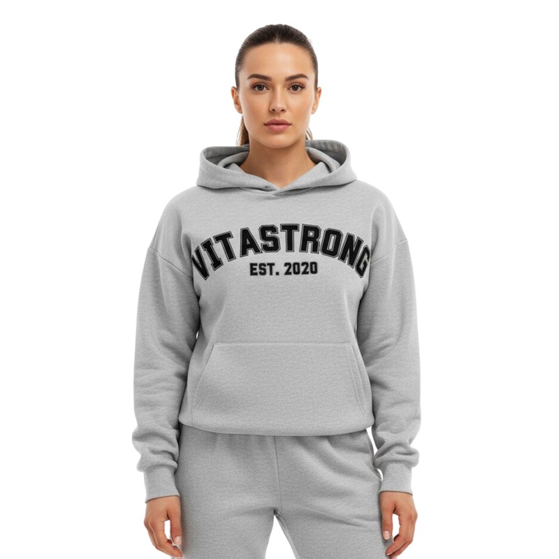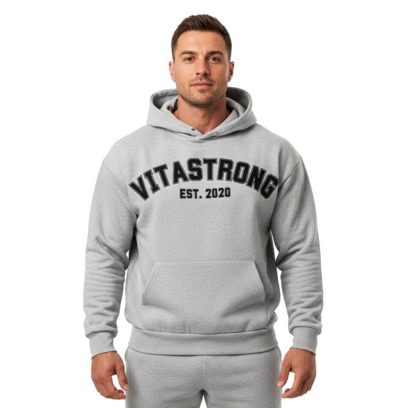 De College Hoodie Grey combineert comfort, volume en stijl. Een unisex sweatshirt met een oversized pasvorm , ontworpen voor iedereen die de Vitastrong-spirit ook buiten de sportschool leeft.
