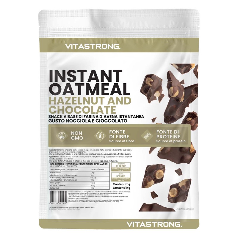 Vitastrong Instant Havermout, Hazelnoot & Chocolade smaak: een omarming van authentieke smaken en uitgebalanceerde voeding. Rijk aan vezels en eiwitten, met het genot van chocolade en de rijkdom van hazelnoot. Schone energie en pure smaak!