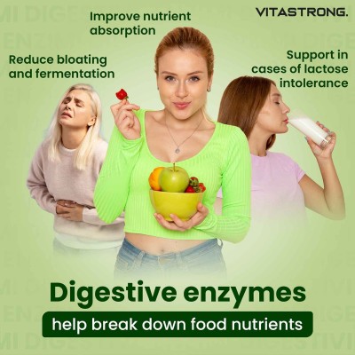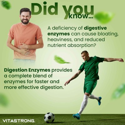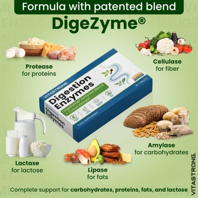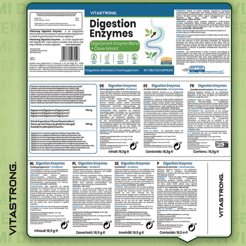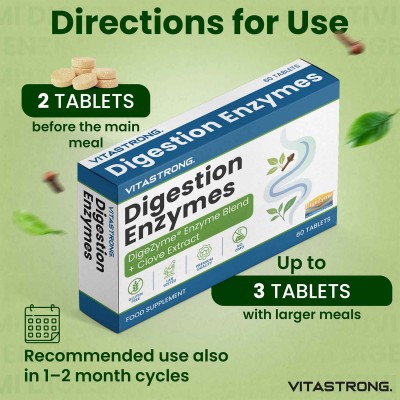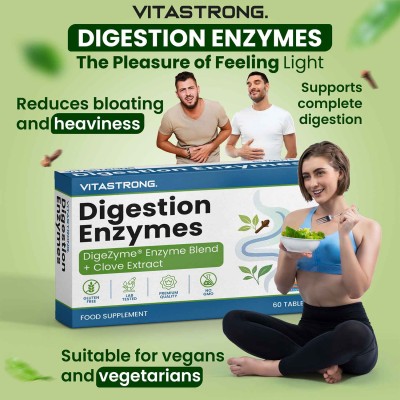 Vitastrong Digestion Enzymes is een voedingssupplement dat is ontworpen om een volledige en efficiënte spijsvertering te bevorderen. Dankzij de gepatenteerde DigeZyme® -enzymenmix en kruidnagelextract helpt het het lichaam de belangrijkste macronutriënten af te breken – koolhydraten, eiwitten, vetten en lactose – en zo een zwaar gevoel, een opgeblazen gevoel en een trage spijsvertering te verminderen.