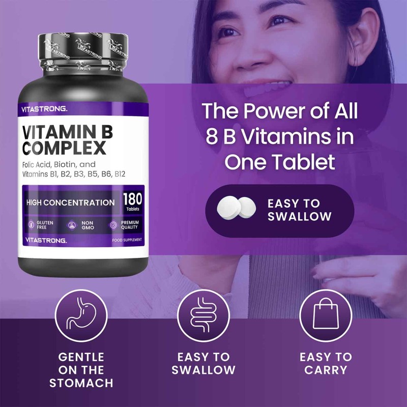 VITASTRONG VITAMIN B COMPLEX is een compleet voedingssupplement dat alle B-vitamines combineert met biotine en foliumzuur, essentieel voor de ondersteuning van energie, stofwisseling, zenuwstelsel en schoonheid. Dit supplement is met name geschikt voor mensen die vermoeidheid willen verminderen, normaal haar, nagels en een normale huid willen behouden en hun algemene welzijn willen versterken.