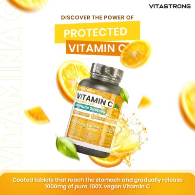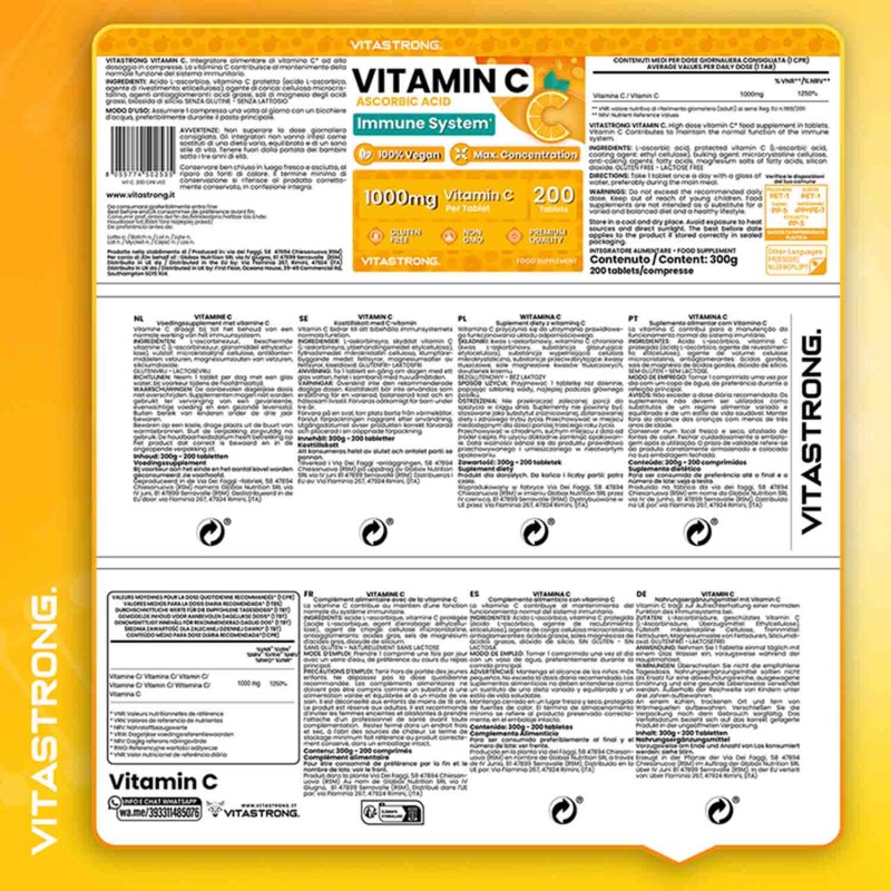 Ingrediënten: L-ascorbinezuur, beschermde vitamine C (L-ascorbinezuur, glansmiddel: ethylcellulose), vulstof: microkristallijne cellulose, antiklontermiddelen: vetzuren, magnesiumzouten van vetzuren, siliciumdioxide.