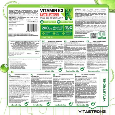 Ingrediënten: Vulstof: cellulose; maltodextrine; trans-menaquinon-7 (vitamine K2); antiklontermiddelen: magnesiumzouten van vetzuren, siliciumdioxide. GLUTENVRIJ – LACTOSEVRIJ