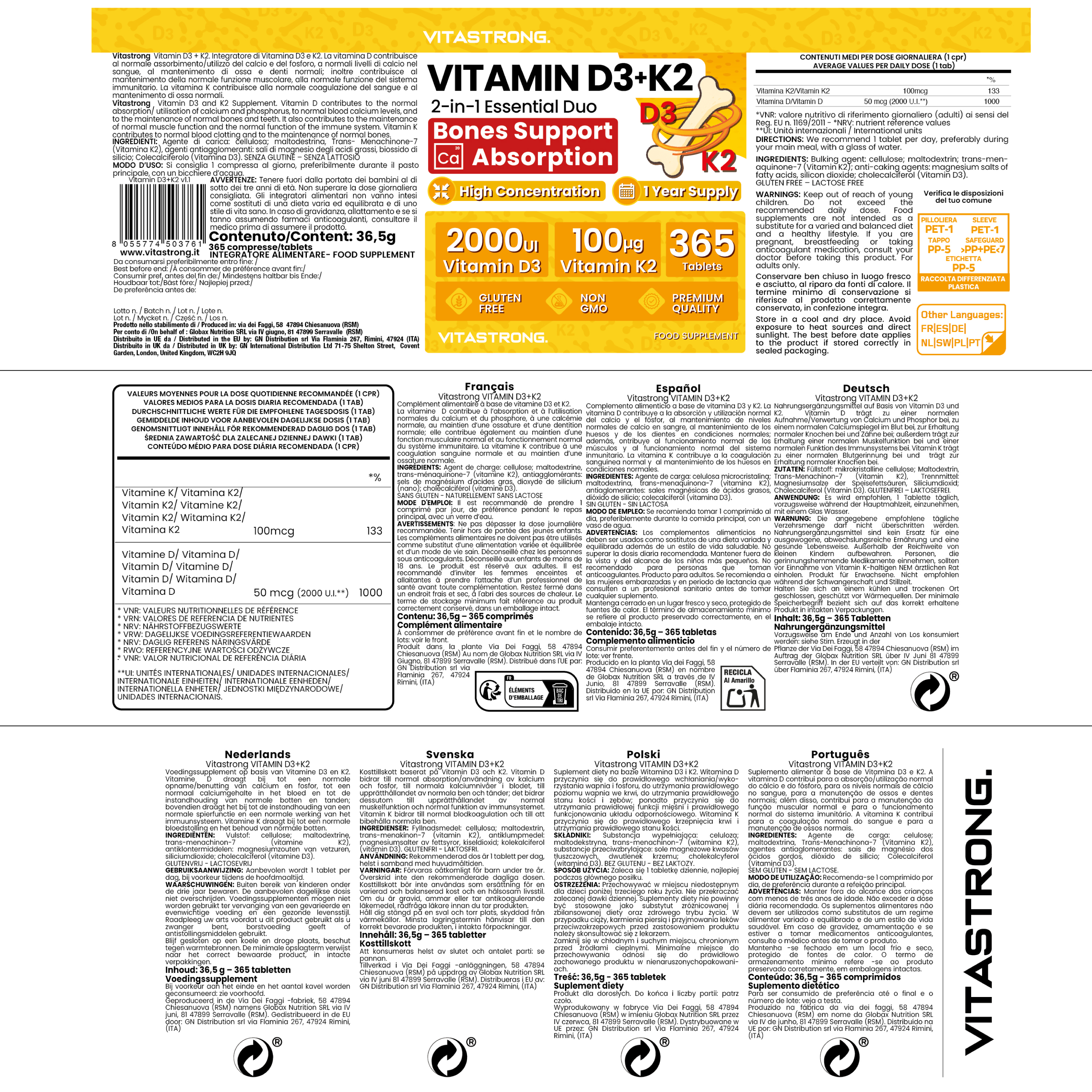 Ingrediënten: Vulstof: cellulose; maltodextrine; trans-menaquinon-7 (vitamine K2); antiklontermiddelen: magnesiumzouten van vetzuren, siliciumdioxide; cholecalciferol (vitamine D3). GLUTENVRIJ – LACTOSEVRIJ