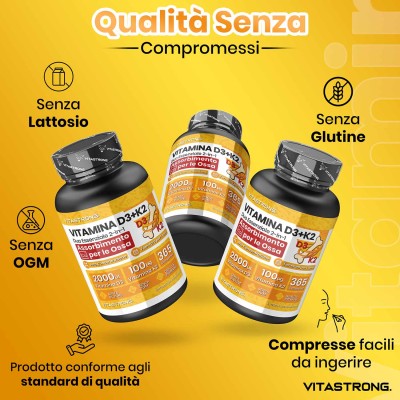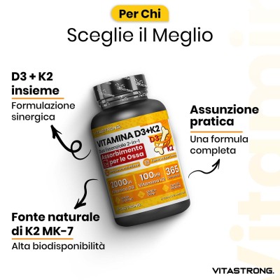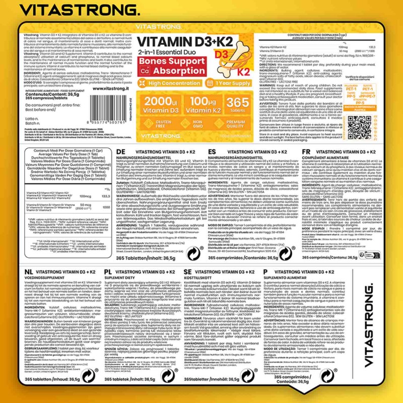 Vitastrong combineert 2000 IE vitamine D3 met 100 μg vitamine K2 MK-7 , de ideale dosering voor een effectieve calciumopname , verbeterde botdichtheid en algehele ondersteuning van het welzijn .