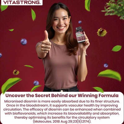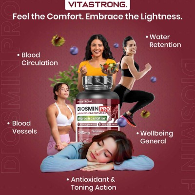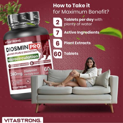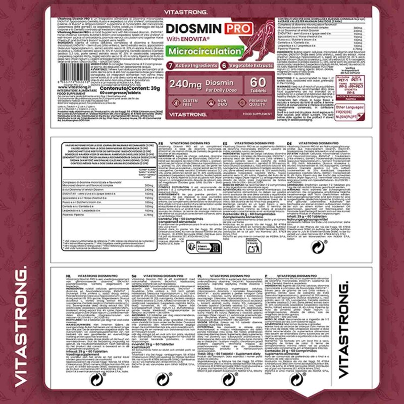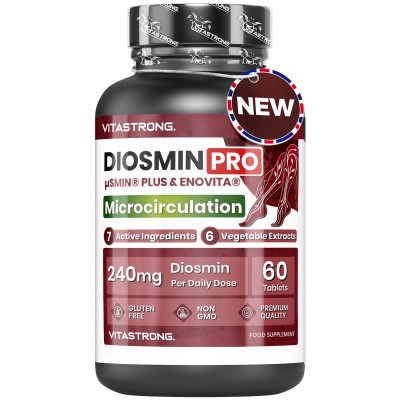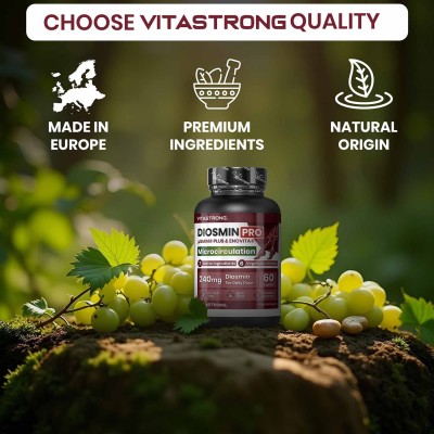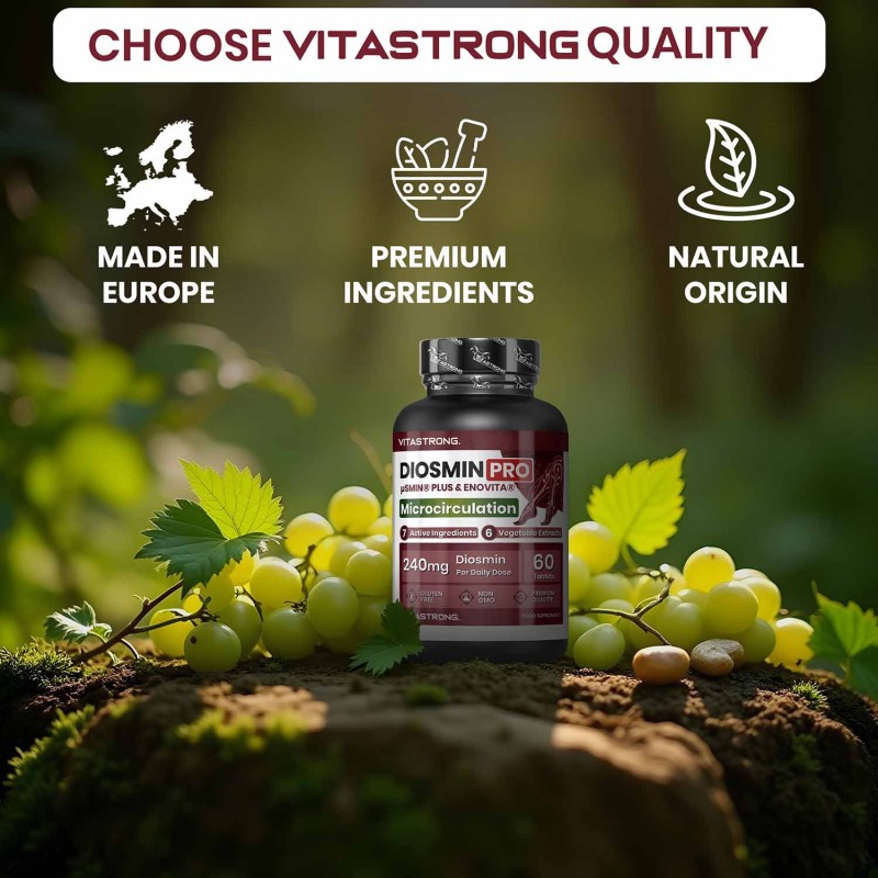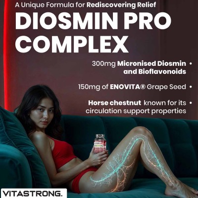 Vitastrong Diosmin PRO is een geavanceerd voedingssupplement dat is ontworpen om een gezonde microcirculatie en het welzijn van de benen te bevorderen. De formule combineert gemicroniseerde Diosmin met ENOVITA®, een krachtig druivenpitextract dat bekendstaat om zijn antioxiderende eigenschappen. Daarnaast zijn paardenkastanje, centella, muisdoorn en lespedeza toegevoegd, ingrediënten die traditioneel worden gebruikt om de veneuze bloedsomloop te ondersteunen en het gevoel van zware benen tegen te gaan.