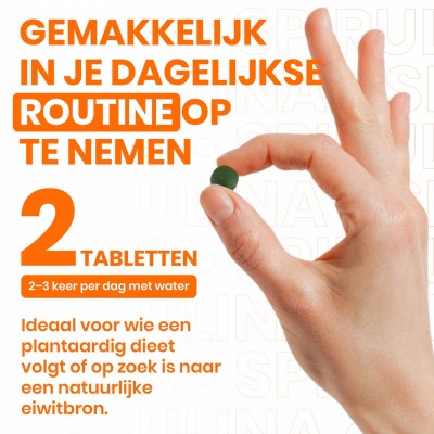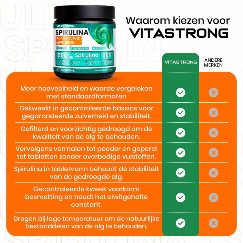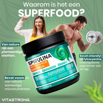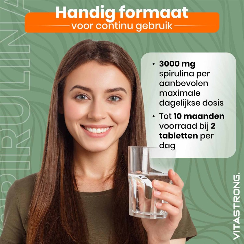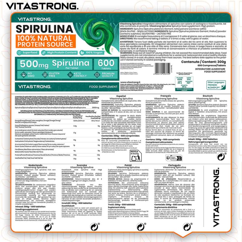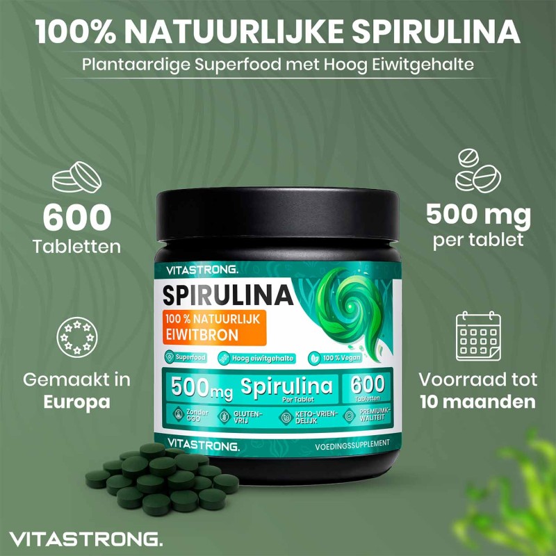 De verpakking met 600 tabletten garandeert langdurige suppletie, waardoor Spirulina Vitastrong een praktische en handige keuze is die geschikt is voor elk dieet.