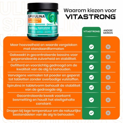 Vitastrong Spirulina is een tabletvormig voedingssupplement samengesteld uit 100% pure spirulina , een microalg die van nature rijk is aan eiwitten, vitaminen, mineralen en antioxidanten.